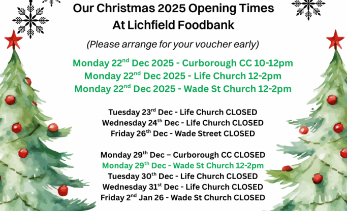 Lichfield Foodbank Christmas Campaign Food banks across the Trussell Trust network are expecting to provide more than one million emergency food parcels between December 2023 and February 2024 – the most parcels ever provided across this period. This equates to an average of one food parcel every eight seconds (11,500 a day) and 7,000 people […]